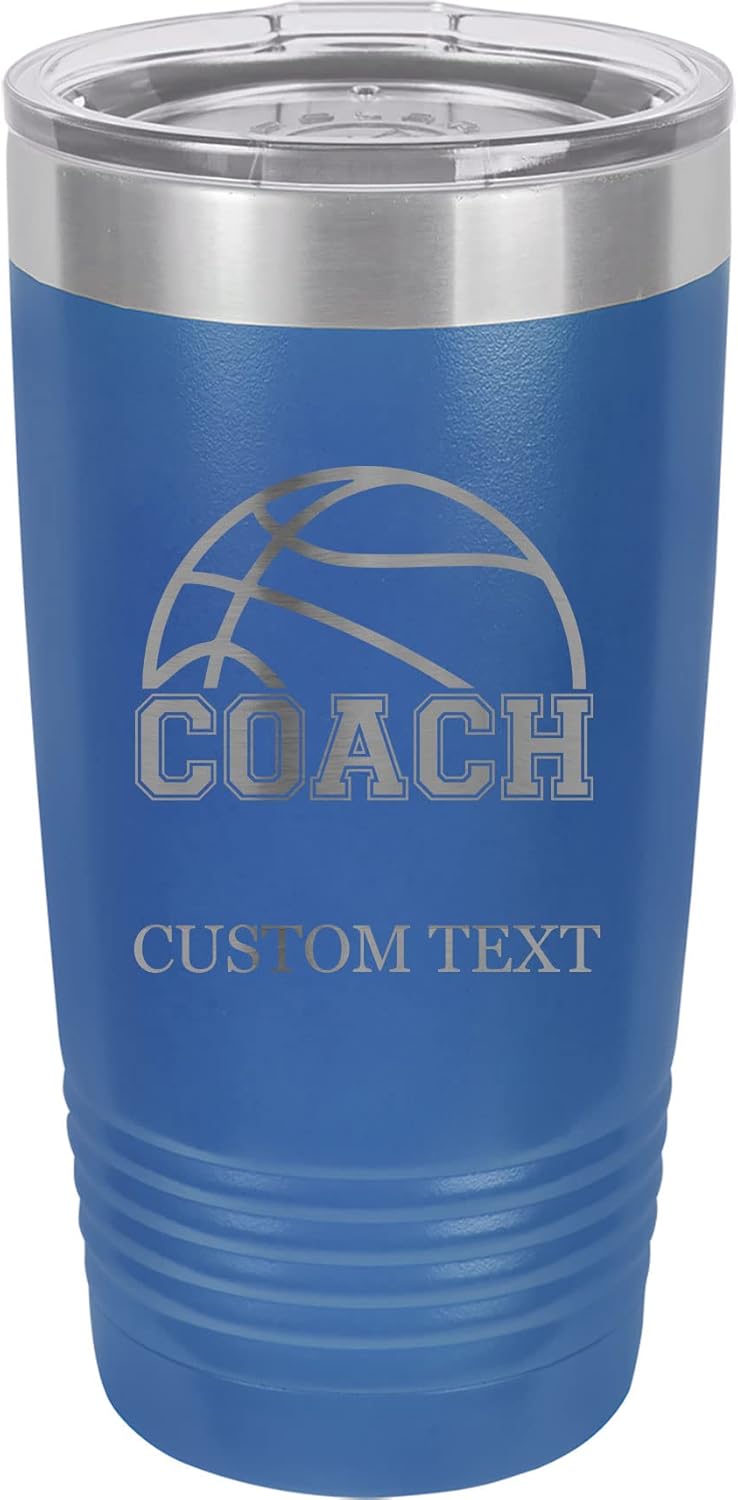 20-Ounce Vacuum Insulated Stainless Steel Tumbler Customized Double-Walled Laser Engraved White Coffee Mug, Basketball Coach , PersonalizedLaser Engraved Coffee Tumbler in the USA by our Artisans The custom coffee mug engraved on the side shown and will not rub off, melt, fade or peel. Easy to gift with the white box and can be a funny or high quality gift that can be customized tumblers for women, men, friends, family, and co-orkers.