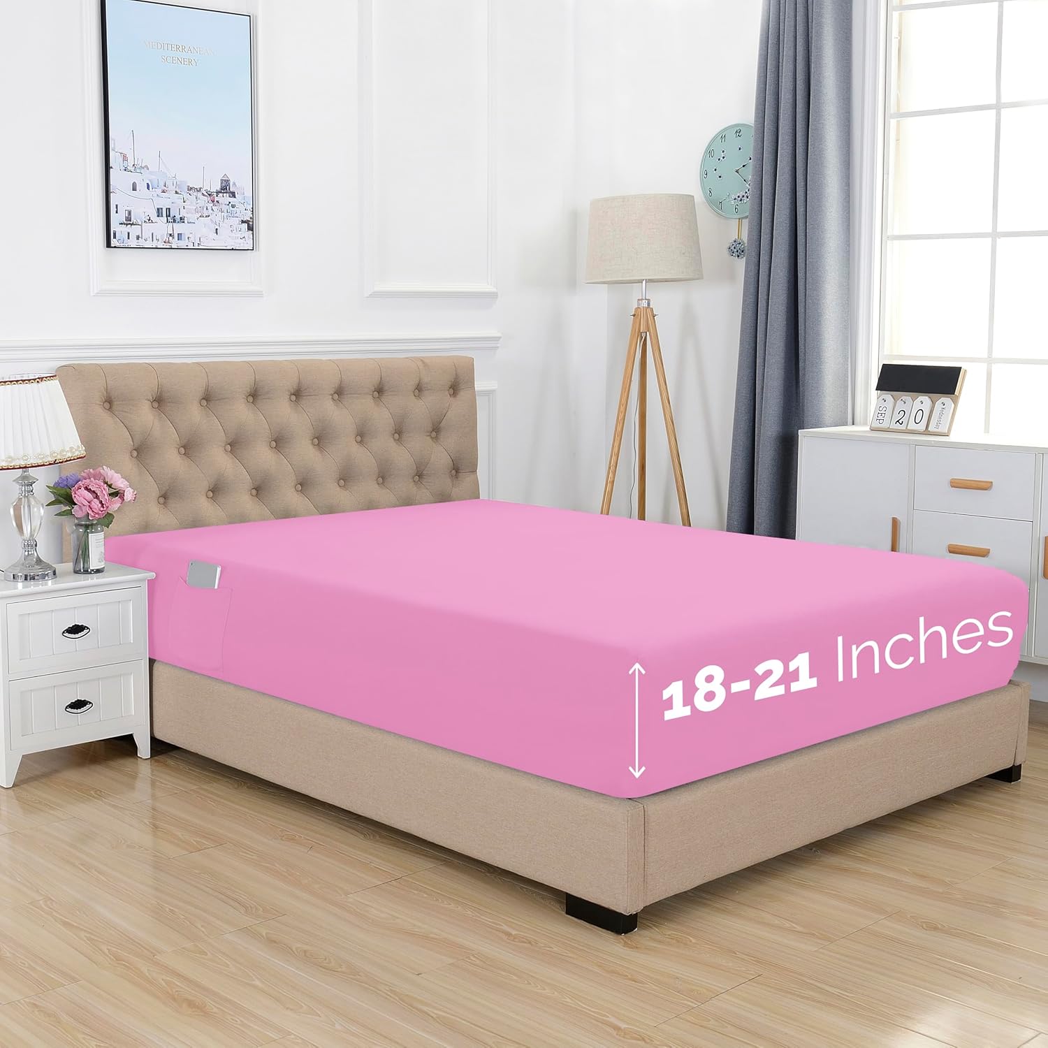 Upgrade your bedding with our Deep Pocket Fitted Sheet featuring Double-Sided Storage Pockets, designed for mattresses 18 to 24 inches deep. This premium fitted sheet is crafted from ultra-soft durable microfiber, providing a luxurious feel while offering a snug, secure fit that stays in place all night. The deep pockets easily accommodate thick mattresses, including pillow tops, memory foam and mattress toppers, ensuring a smooth and wrinkle-free surface. What sets this fitted sheet apart are the convenient double-sided storage pockets, perfectly positioned on both sides to keep your essentials within arm's reach. Store your phone, glasses, remote controls, books, or other nighttime necessities right beside you, eliminating the need for a bedside table. These pockets are designed to hold your items securely, offering easy access while you relax. The fabric is wrinkle-resistant, fade-resistant and machine washable, making it easy to care for while maintaining its fresh look and feel. Elevate your sleep experience with this practical and stylish fitted sheet, combining functionality with comfort.