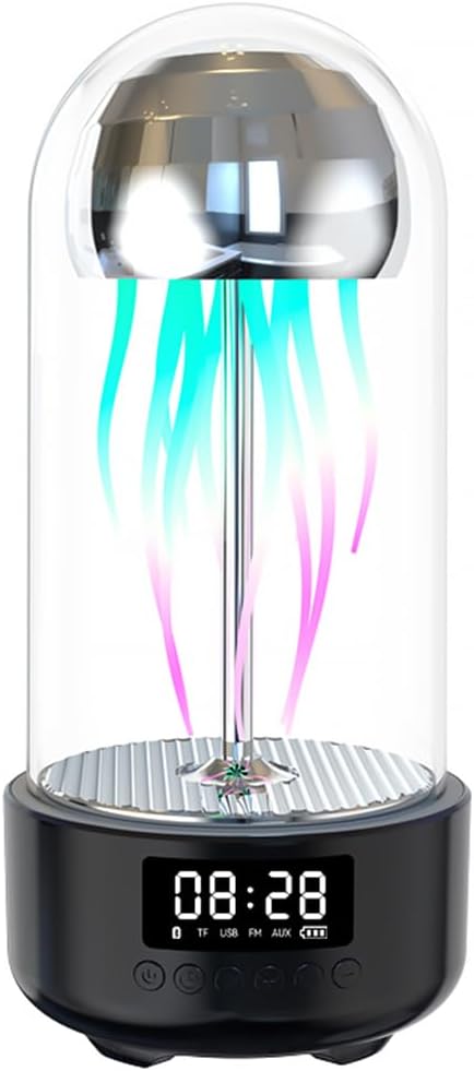 Specifications:.Material: ABS.Installation Type: Desktop.Speaker Type: Wireless Speaker 5.0.Special Features: Jellyfish LED light, lightweight, LED display, portable wireless Bluetooth speaker, can be used as a clock.Recommended Uses: For smartphones or tablets, gaming consoles, computers, surround sound systems, music players.Main Color: Four colors available: Grey, Business Grey, Elegant Purple, Light Pink.Charging Time: 2 hours.Power Source: Battery operated.Product Weight: 603g.Package Weight: 850g.Product Dimensions: 11 x 11 x 24cm.Package Dimensions: 28.5 x 14 x 12.5cm.Packing: Graphic Carton.Ages: 16+ Package Including.User Manual*1.Jellyfish Bluetooth Speaker*1.USB Data Cable*1
