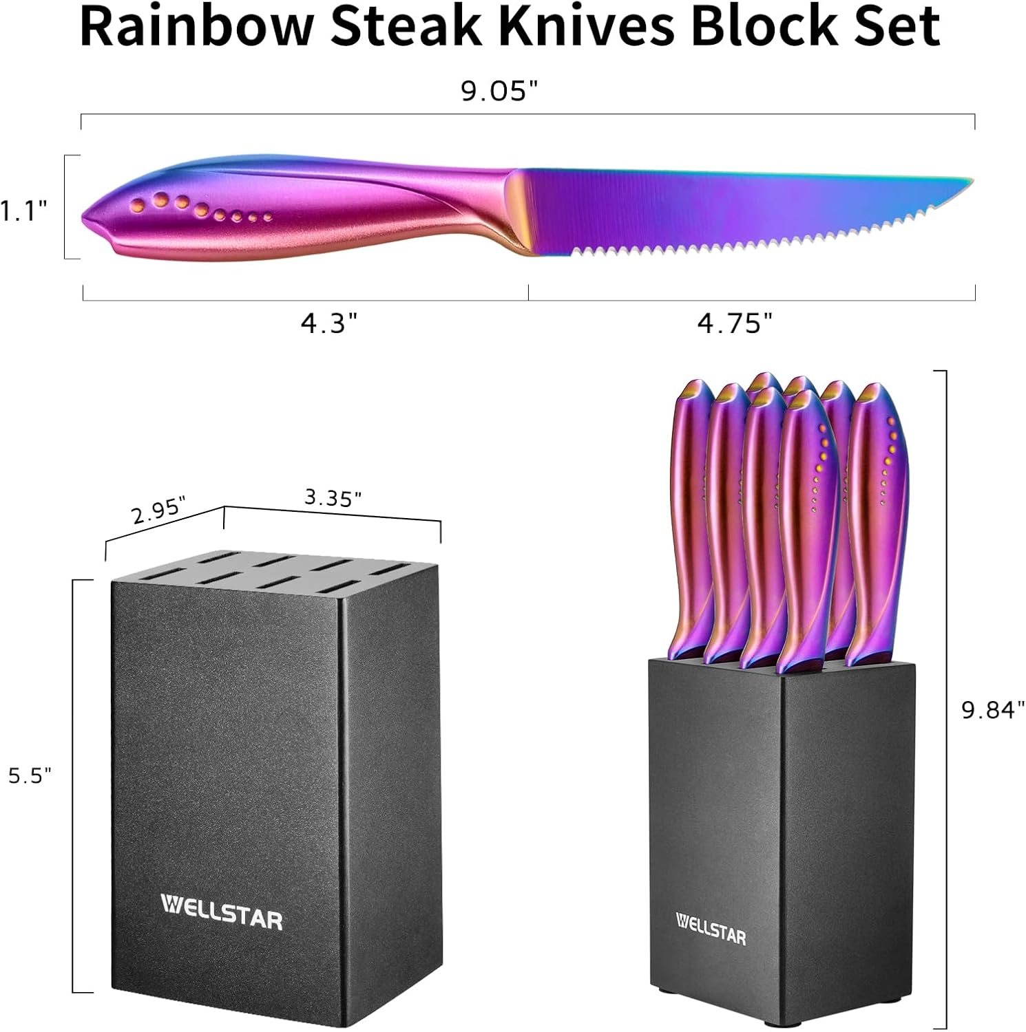 | Included Components | 1pc Wood Knife Block, 8pcs Rainbow Steak Knives |